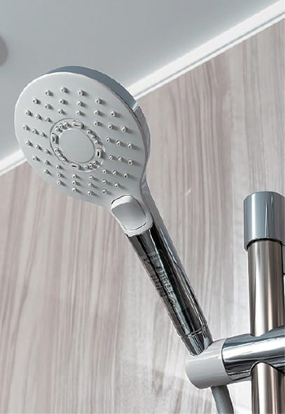 シャワーの高さを自由に調節できるスライドバー。立ったままでも、座ってもちょうど良い高さでシャワーが使えます。