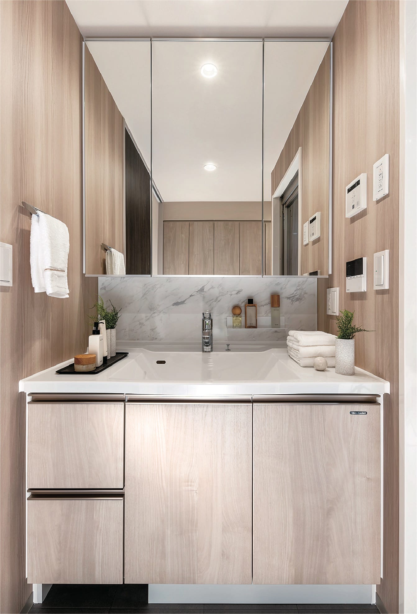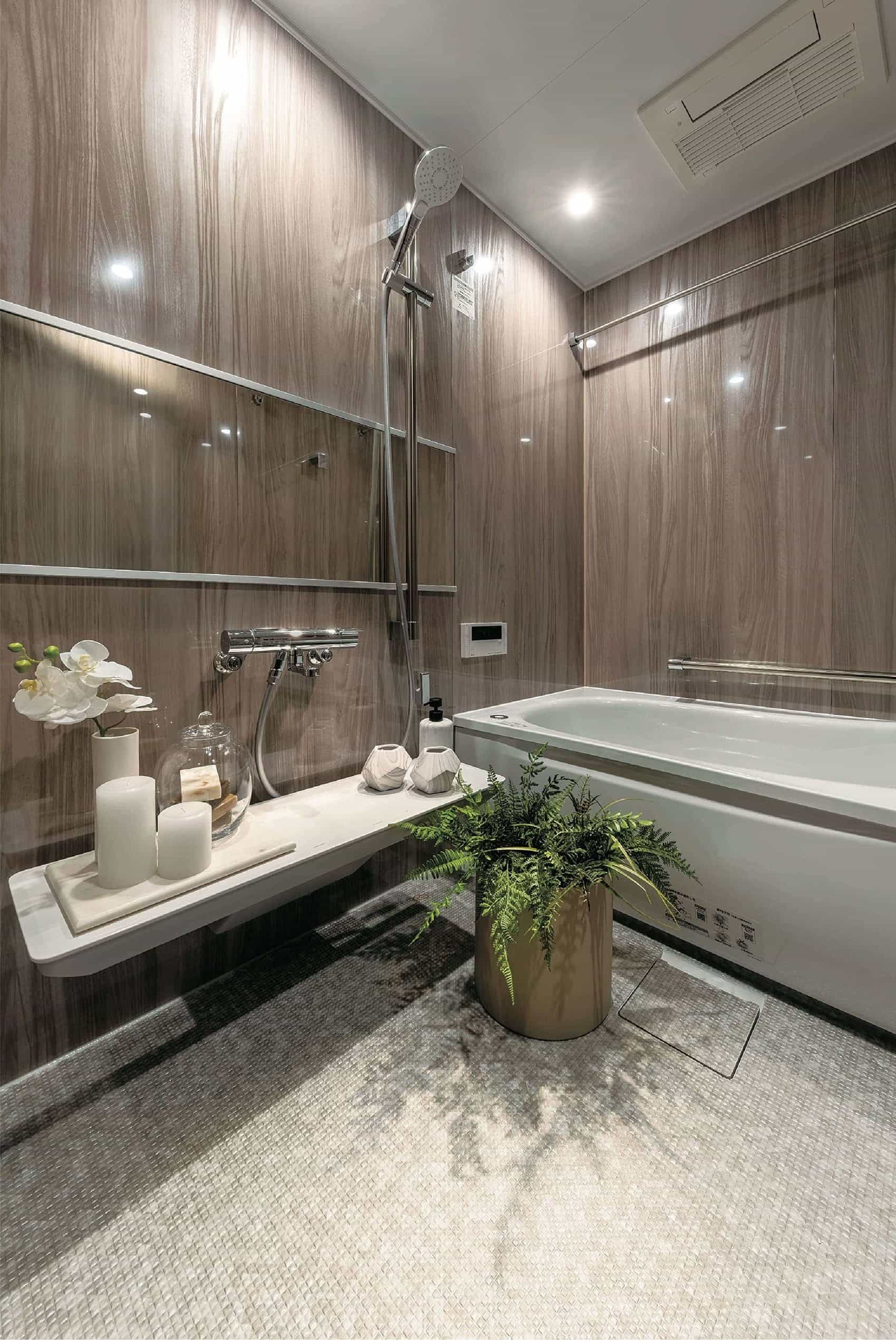 いつも快適なリラクゼーションタイムが楽しめる先進設備を装備したバスルーム。すっきりと清潔感あふれるデザインで、入浴後のお手入れもラクラク。雨の日でも洗濯物が乾かせる便利な浴室暖房換気乾燥機も備えています。