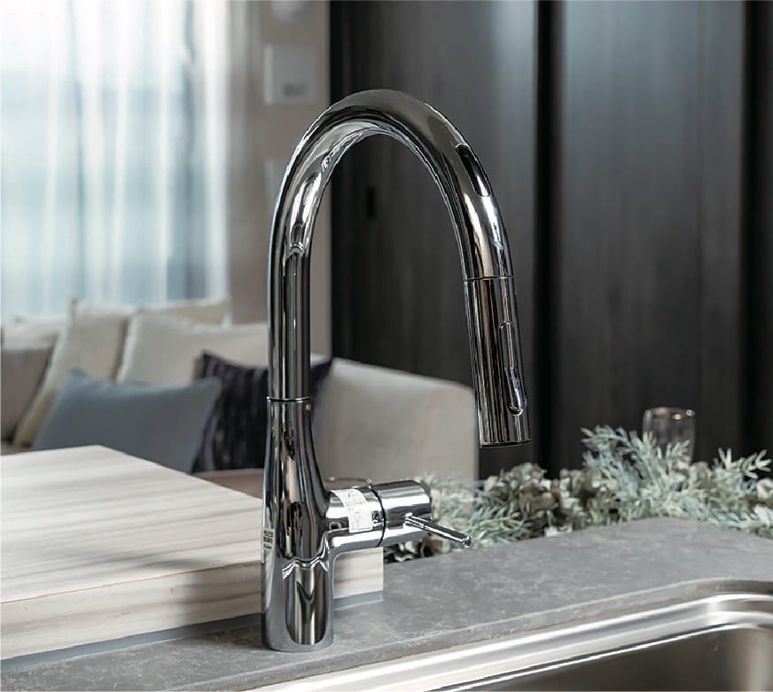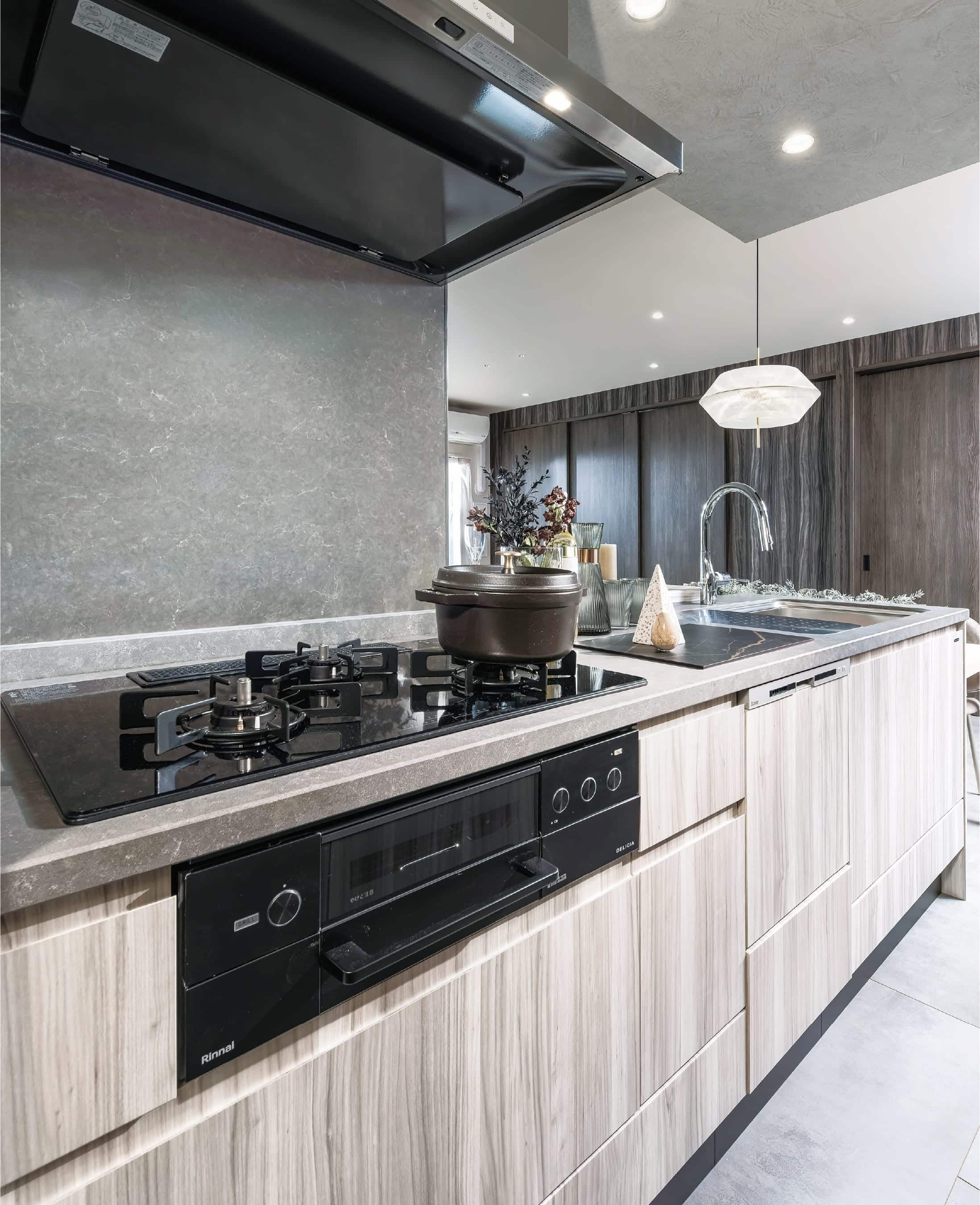 リビングダイニングに面した開放的なキッチンは、忙しい日々のキッチンワークをサポートする機能が満載。ここに立てばお料理が楽しくなる!安全性や快適性、清潔感にこだわった機能美。カラーリングや素材感、フォルムにこだわった美しさ。どちらも備えたキッチンは妥協のない暮らしの真ん中に。ここでなら理想のキッチンライフがかなう。暮らし方も変わる。