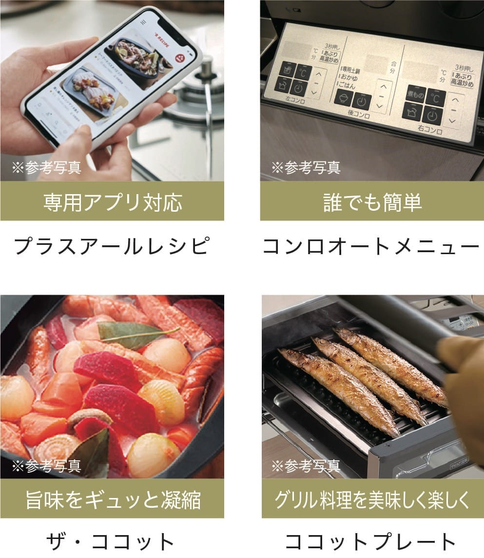 全バーナーにSiセンサーを搭載したガラストップコンロ。見た目にも美しい洗練されたシャープなデザインに加え、お手入れが簡単な結晶化ガラストップ、表面温度の上昇を抑える多彩な機能を備え安全性にも優れています。エールヴィータ宝町はスタイリッシュなオールブラックモデルを採用。インテリアを邪魔せずキッチンをシックな印象に導きます。
