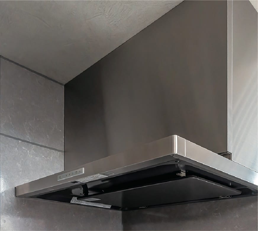 ステンレス製のスリム型レンジフード。整流板とグリスフィルターがホーロー製なのでお手入れが簡単です。