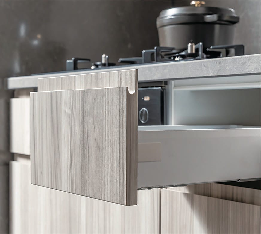 引き出しが閉まる直前で衝撃を吸収するソフトクローズ仕様。収納物を傷つけにくくやさしい設計です。※コンロ横小引出もソフトクローズ