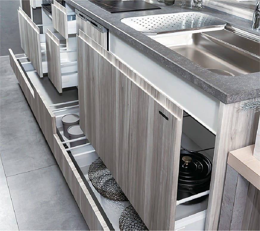 カウンター下の収納はスライド収納となっています。また、閉めた時の衝撃をやわらげるソフトクロージングを標準装備しました。