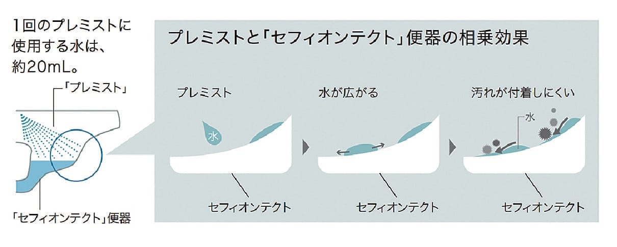 便座に座ると自動で便器にミスト(水)をふきかけて、水のクッションを作ります。便器表面をツルツルにする「セフィオンテクト※1」との相乗効果で、便器を汚れから守ります。