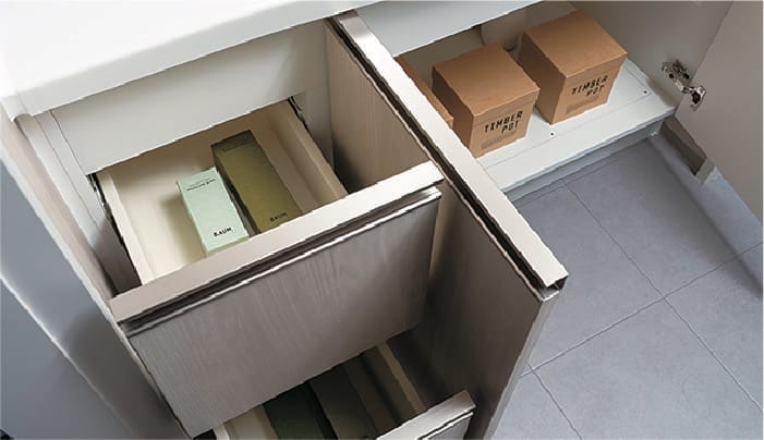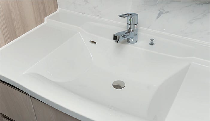 洗面ボウル下の収納に加え、サイドに引出しを備え、小物類や洗剤など、美しく整頓できます。