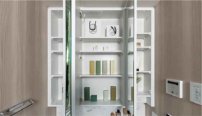 メイクアップしやすい三面鏡タイプ。鏡裏には小物を整理できる収納棚を備えています。