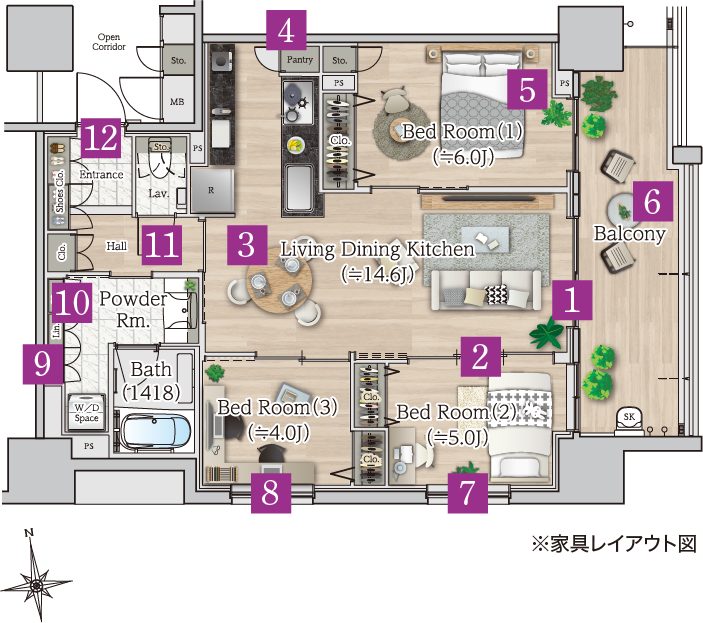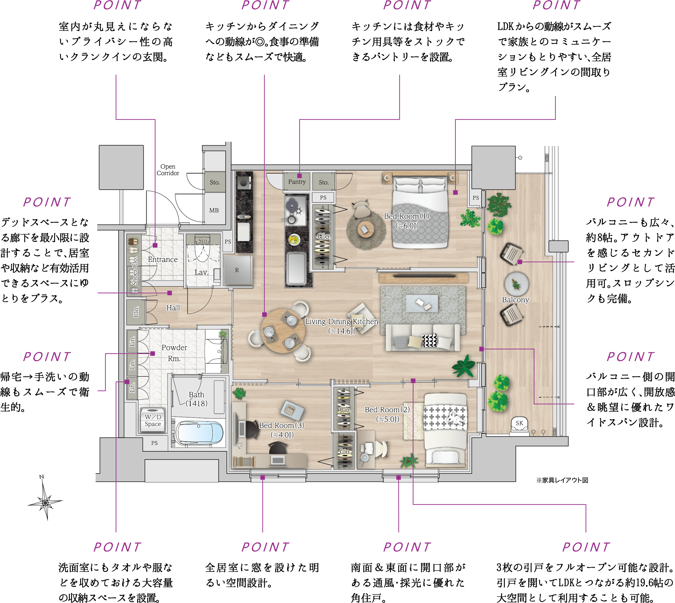 廊下が短く居住スペースを広くとった南東角住戸プラン。